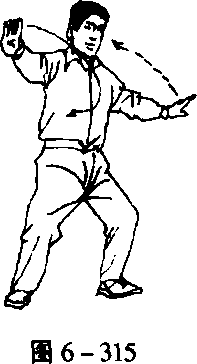 掌自右而上由顺缠转为逆缠,弧形缠至右颊旁,掌心斜朝左前方 (图6-310)。以下同第二十二式“倒卷肱”动作1中图说明(图6 -311、312,附正面图)。