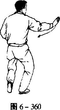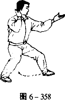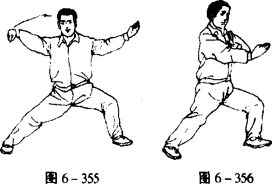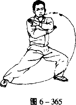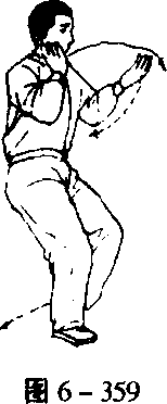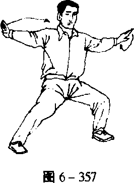 -362)。身体继续右转,右腿屈膝下蹲,左脚提起向左侧(东北) 横迈^大步,重心左移,弓左腿;同时,两手逆缠,右掌向右上、 左掌向左下分别展开,掌心皆朝外(图6-363)。2.两臂相合 身微左转,重心继续左移,弓左腿。同时,