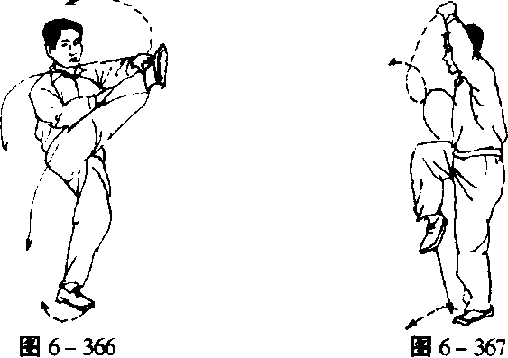 【要点】① 该式是由紧合到大开,此时要求气势下沉;在左转时两膊须 相系,是合中寓开;以后又开,是开中寓合。② 由于左掌交叉地拍击右脚面外侧,所以称为十字摆莲。拍后 以左拳上举、右拳下翻同时发劲,以这种发劲的协调来取得转体后 的稳定。③ 做十字摆莲的动作,常常会感到舒适和背脊发热,这是促使 气遍身躯的现象。左掌逆缠向左迎拍右脚面外侧(图6- 366)。以左脚跟为轴,身体 右(西转);同时,两掌变拳左逆、右顺缠,右拳经胸前而右向上、 左拳转臂屈肘自左而上一齐放劲,右拳高与胯平,拳心朝上,左拳 高稍过于头,拳心朝右(图6-367)。