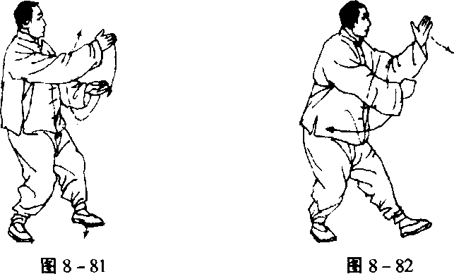 4. 左脚向前落下,重心渐移于左腿,腰向左转, 使身体转至胸中线对右前方约30度,同时,两掌继续向左平摆, 右脚随身体左转,轻轻提起,稍向右前移动半步落下,脚前掌着 地,目视两掌移动(图8-80)。