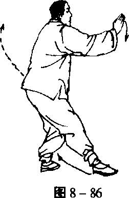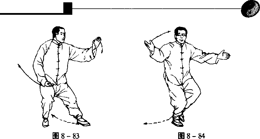 2. 提脚举手 重心逐渐全部移于右脚上,身体继续右转, 左脚经右踝内侧提起,同时,左掌外旋前伸,掌心向上,右掌后 抽,向后、向上撩至手掌与肩齐平,掌心向上,目视右掌,又顾及 左掌(图8-84)。