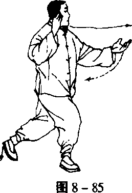 1. 转身抽手 右胯根收住,身体右转,左脚尖轻落地,同 时,左掌稍向外旋前伸,右拳变掌,肘带腕及手掌外旋经右腹前后 抽至右胯根前,掌心向上,指尖向前,目视左掌(图8-83)。