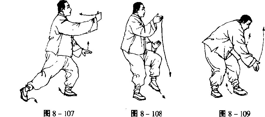 3. 虚步插掌 重心在右脚,左脚略里收,落下,脚前掌虚 着地,成左虚步,腰向左转,左胯根收住,折腰下沉,左掌下按于 左胯大腿旁,掌心仍朝下,指尖向前,右掌向前下方插出,指尖向 前下,腕与左膝齐,目视右掌(图8-109)。