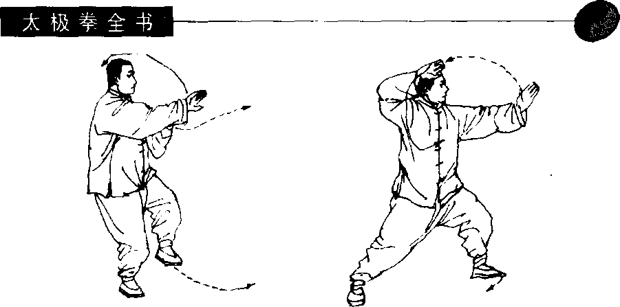 ① 当重心前移时,右腿渐起,腹部微向前送,右肩、右肘、右 手微向前展伸,左肩,左肘、左手微向下沉,不可呆滯不动。