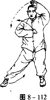 1. 扣脚握拳 左腿承担重心不变,左脚尖里扣90度踏实, 左胯根微收,身体右转,同时,随转体,右肘下沉,右掌渐握拳由 上向下、向右划弧置于左肋前,屈肘横臂,拳心向下,左掌弧形上 举至左额前上方,目随视右掌,后平视前方(图8-112)。