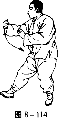 3. 迈步撇拳 重心在左脚上,身体右转,右胯开,膝外旋, 右脚向前稍偏右迈出,脚跟着地,同时,右臂外旋,继续向前弧形 撇出,拳心向里,与胸同高,左掌由右小臂外,稍向下向里向上划 半弧,置于右小臂里侧,目平视顾及两手动作(图8-114)。