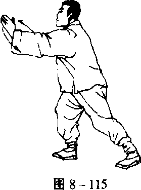 4. 弓步推掌 重心渐移于右腿,右脚踏实,弓右腿,蹬左 脚,左脚尖稍内扣,成右弓步,同时,右肘下沉,右拳回抽收于腰 间,拳心向上;左掌由胸前经右臂里侧上方向前推出,掌心斜向 右,指尖向上,目视前方顾及左掌(图8-115)。
