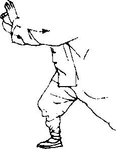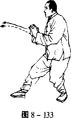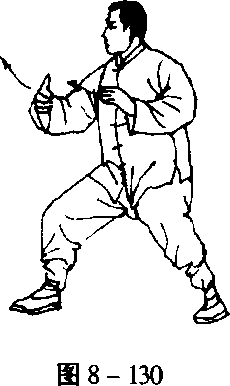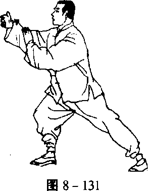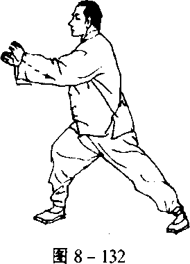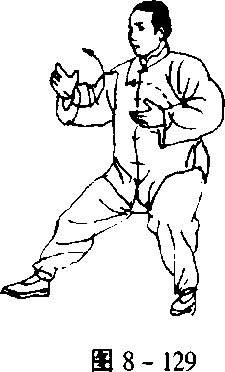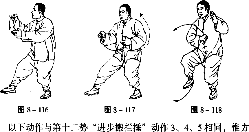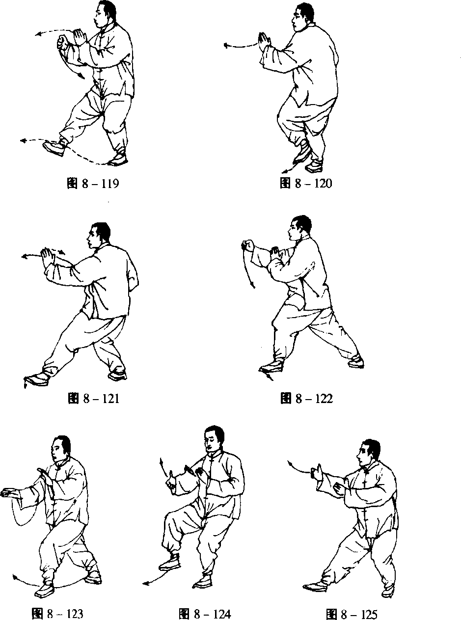 以下棚、攉、挤、按的动作与第三式“揽雀尾”——即自左右 棚式动作4起至按式止——相同(图8-124?134)。