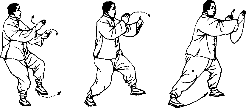 ② 两掌合抱交叉后仍须随左腿起立而柔和地向上向外微移,才 显得轻灵、沉着。如果左腿起立时两掌交叉着不动,就会产生呆滞 现象,合抱时两掌腕部不可松懈地弯屈C