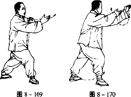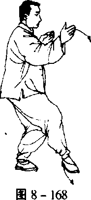 左掌屈肘向右弧形划至胸前,掌心朝下,右掌臂外旋使掌心朝上, 目视右掌(图8-168〉。