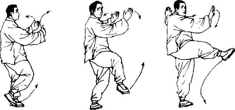 1. 提脚抹掌 重心完全移于右腿,右膝微屈下蹲,左脚提