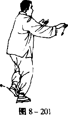 2. 提脚换步 右脚落于左脚旁,两脚平行,两脚尖斜向左 45度方向,稍窄于肩宽,先脚尖着地,逐渐全脚掌着地,重心全 部落于右脚,左脚提起,腰向右转,同时两掌继续向右下方移掌, 左掌心翻向上,目视前方,顾及两掌(图8-201)。