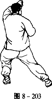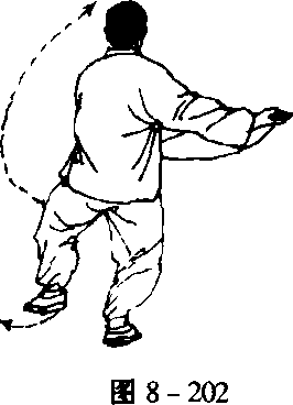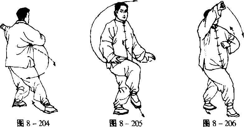 1. 扣脚落手 左脚尖里扣踏实,身体渐渐右转,坐实左腿, 右脚渐渐提起,脚跟先离地。同时,左拳变掌弧形向左下落,掌心 朝下;右拳变掌,臂外旋使掌心翻朝上,移于左肱前。眼稍关顾左 掌,即随体平视转移(图8-204)。