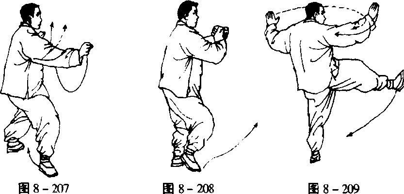 左转,重心随着左移;同时,左拳随转体向左平移,右拳向右弧形 下移(此时两拳已幵始松开);眼随转体平视转移(图8-207)。