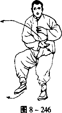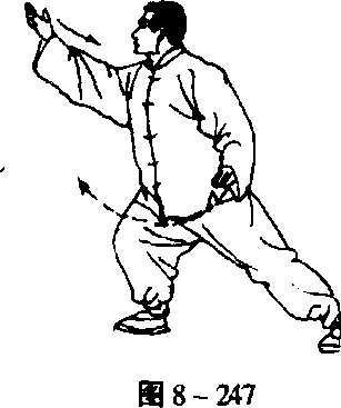 2. 马步分靠 右脚向右前方迈出,脚跟着地,重心前移, 成右弓步,同时,右掌随转体向前上偏右以拇指一侧弧形例出,掌 心斜向上,高与眉齐,与右脚上下对,方向一致,左掌向左弧形下 采于左胯旁前,肘微屈掌微坐,掌心向下,指尖向斜前,目及右掌 例出(图8 - 247)。