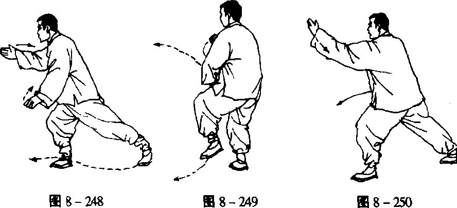 2. 左脚向左(西,稍偏南)迈出,身体渐渐左转,先以脚跟 着地,随着重心渐渐移向左腿而至全脚踏实,弓左腿,蹬右腿,成 左弓步。同时,左掌随转体向左上方以大拇指一侧弧形例出,高与 眉齐;右掌向右弧形下采于右胯旁。眼神关顾左掌冽出,稍先于左 掌到达左方(图8-250)。