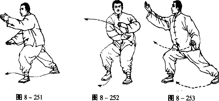 动作与以上“左势分鬃”动作相同,惟左右相反(图8-251、 252、 253)。