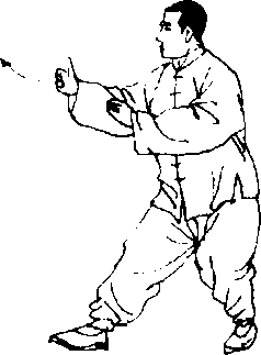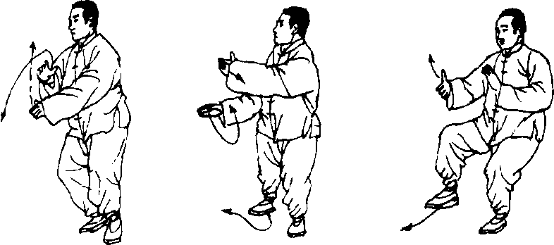 ③ 后腿提起迈出时,要利用前腿腰胯根处微外旋内收下沉坐 实,做到身正、肩平,肘不失肋,全身自然松沉。