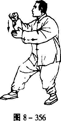 重心渐渐移向左腿,身体左转。同时,左肘随转体下沉,左臂 外旋使掌心渐渐翻朝上;右掌变拳向前上伸于左掌上侧。眼神关顾 右拳前伸(图8-357〉。