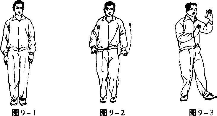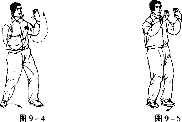 向左斜前方45度方向迈出,脚尖上翘,脚跟着地,两腿仍为左虚 右实;同时两手向胸前中线部位举起,手指尖均向上,手心侧向 前,成竖掌,左手在外,高与口平,右手在里与心口相齐,两掌在 胸前不相逾越胸中线,各管半边身体,目视左斜前方(图9-3)。