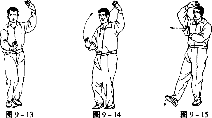 前伸,肘下垂,两手同时竖掌下落与两胯平时,即向左后分开,再 向上划弧,竖掌合于胸前成推球状,指尖髙与肩平;目视西南方 (图9一17)0