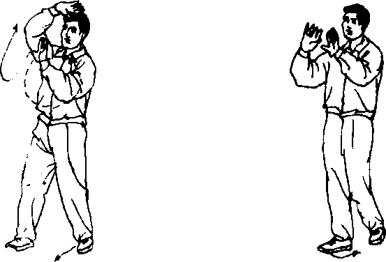 ② 右手上举时,右胸下沉,并有右手提领右足迈出之意,左手 下落有上升之势,定势时,两手之间要有呈T字形虚连之意。
