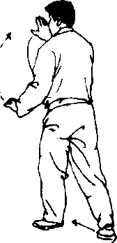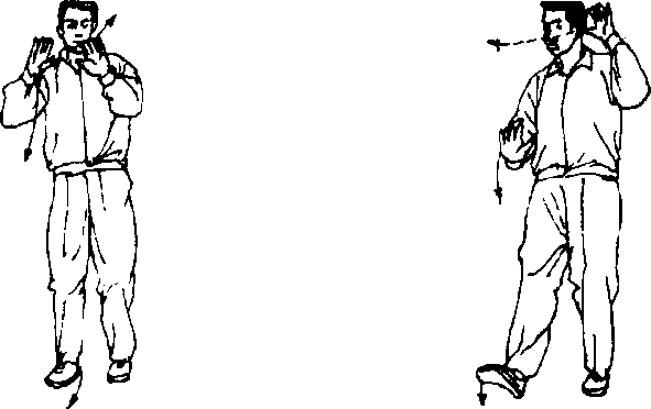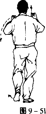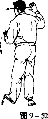 以下与第七式“搂膝拗步”的分动2、3、4相同,惟方向、角 度不同,本动为西北方(图9-52、53、54)。