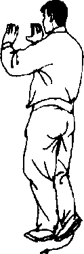 4. 跟步捧球 重心移至右腿,左脚跟步,同两手左右分开,