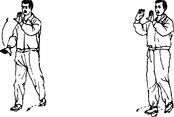2. 图 9 -55 图 9-56 迈步举掌 重心不变,身体微向右转,右脚向西南方迈 出,脚尖上翘,脚跟着地,两腿仍为左实右虚;同时右手竖掌下落 至右腹前,左手竖掌向左面颊旁举起,面对西南方,目平视(图9 -56)。