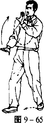 地,右脚以脚跟为轴,扣脚尖与身体一同向左后转225度,对正北 方,两手不动随之转动,两腿为右实左虚,目视北方(图9-59)。
