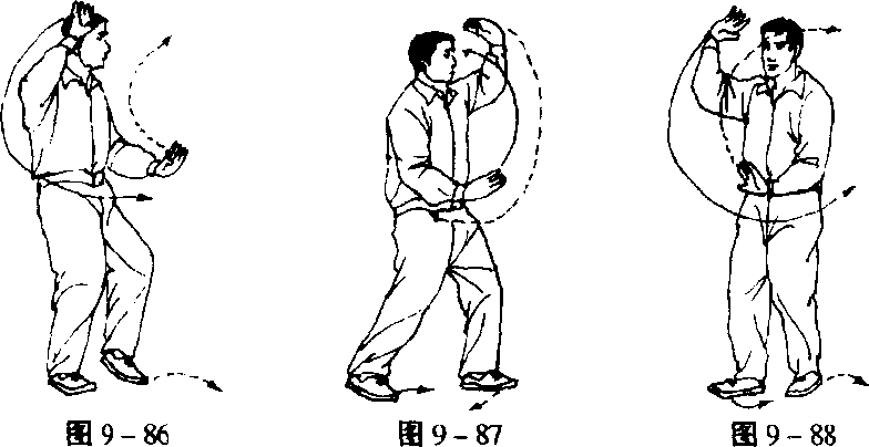 2. 收脚云手 重心移于左脚,以左脚跟为轴,左脚尖扣向 正南方踏平,右脚收于左脚旁,脚跟着地,脚尖上翘,同时左手向 左、向下划半圆,抄至左腹前,手心朝下,右手竖掌经腹前向上划 弧,右前臂逐渐斜横举于额前,手心朝前上方;两手上下相对,面 对西南,目前视(图9-88)。