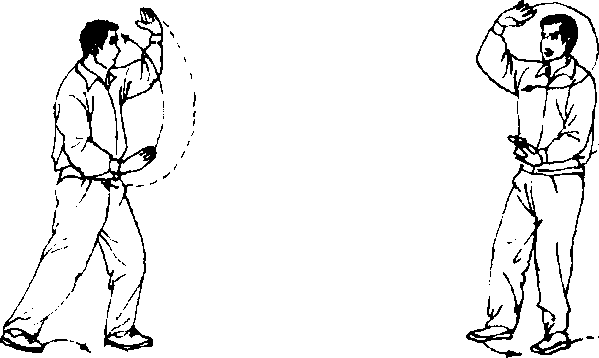 ② 右手上举时,要有提领右脚回收之意,右肩不可随举手而上 耸,而要下沉,右脚收向左脚时,身体应微微右转,不可幅度变 大,上下运动协调一致。