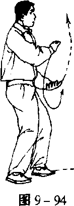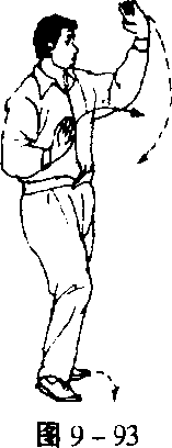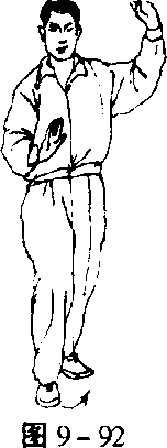 向下划半圆抄至右腹前,手指朝前,左手举 至齐顶,手心向上;面对正南方,目前视 (图 9-92)。