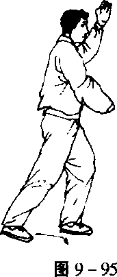 1. 弓腿握拳 重心落在右腿上,左脚向左斜角(东北方向) 迈出,脚尖上翘,脚跟着地,右脚跟蹬地,左腿前弓,左脚落平, 身体前移,重心开始移向左腿,但是此时两腿仍为右实左虚,同 时,左手由下向上握拳划弧撩至头顶前,拳心向下,右手由胸前向 下落至腹前,前臂外旋并向外支撑,右手握拳,拳心朝上,两拳拳 心上下相对;面向右转,目视东南方(图9-95〉。
