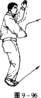 2. 前移收脚 重心移于左脚,两腿变为左实右虚,右脚提 起至左脚旁,脚前掌点地,面对东南。目视东南(图9-96)。