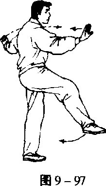 1. 分掌踢脚 重心仍在左腿,右脚提起向右斜前方(东南) 方向踢出,脚高与左膝平,同时,右拳上举,左拳下落,两拳与肩 平时变为竖掌,向左右分开,右手高与肩平,左手略低,右臂与右 脚同向,左腿保持曲蓄,目视东南方向(图9-97)。