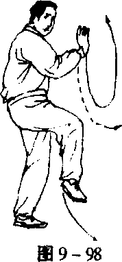 2. 落脚合掌 左腿独立支撑,右脚屈膝落脚,同时,两手 竖掌合于胸前,高与肩平,目视东南方向(图9-98)。