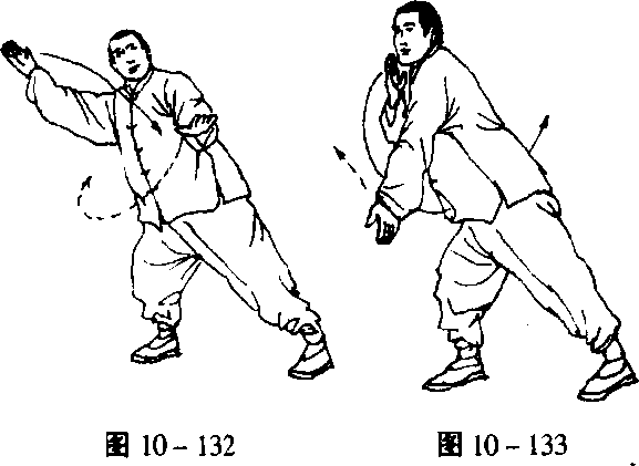 左脚向前上半步,再变成弓步,左掌上架,掌心向外,右掌向 前推出,目视右掌(图10-138)。