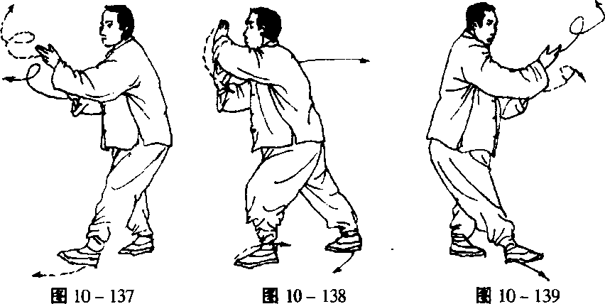 图 10-134 图 10- 135 图 10-136脚跟着地,成虚步,同时,左掌向前,向上抄抱于左胸前,手心向 上;右手从上向下翻掌扶于左腕处,手心向下,目视前方(图10 -137)。