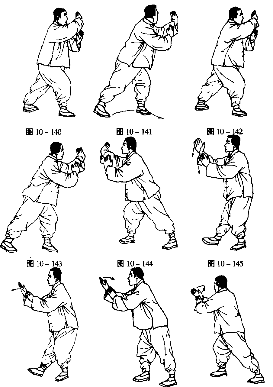 6. 右架推掌 同分动4,唯面向右斜前方。若面南起势,则 此动面向西(图10-142、143、144)。