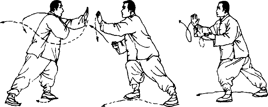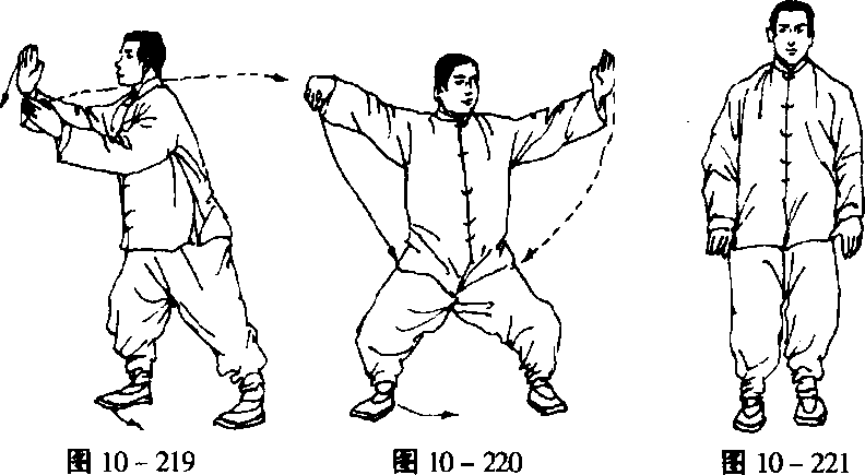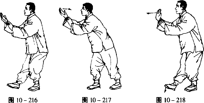图 10-213图 10-214图 10-215本式是重复式子,从上式(图10-212)左脚上前一步,右拳 变为俯掌,左拳变为仰掌,左掌微微抽回,右掌向左掌前落下,左 掌再从右掌上面向前伸出,转腕变为立掌,身体与视线均向正东 (图10-213)。也有在本式前先做一“上步高探马”的式子,再接 做迎面掌的,本书认为略去高探马在动作上比较紧凑,故照旧不 改。图 10-213图 10-214图 10-215第八十式知奢教身接 第八十一式上步;t棵爲 第八十A式上#视省見 第八十玉式单鞭以上四式为重复式子,动作说明同前(图10-214?220)。