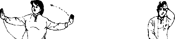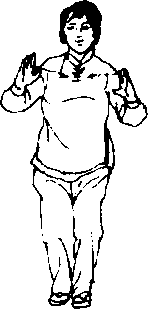 米处,脚尖着地,两脚尖相齐,两腿弯曲,同时,左手由左侧平举 向上,向额前划弧,手心向外,至于额前,手背靠近额头天庭穴