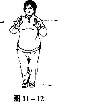 落地,右脚以脚跟为轴翘起脚尖向左扣转90度,两脚尖正对前方, 两脚之间约10厘米,身体也随着左转,同时,两手心相对,指尖 向上,分别向左右分开,开到两虎口与两肩相对,两手与肩同宽, 微停,目视前方(图11-11)。