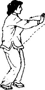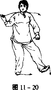 渐过渡为全脚掌着地,重心后移,左脚略往后撤步至右脚前,前脚 掌着地,同时,右手向后回抽,左手向前伸出,两掌五指都伸直, —546 —