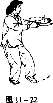 虎口朝上,左手往前伸至极处,右手回拉于心口前停住,右手指尖 距左手指尖约有一个手掌的距离,目视前方(图11-22)。