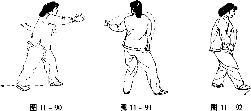 2, 撤步收拳 重心后移至右腿,左脚向后撤一步,两手变 拳由前向下往回经左髋侧,往后、向上、再往下划一个大弧落于腹 前,同时,右脚尖翘起向左摆直,目视前方(图11-91、92)。
