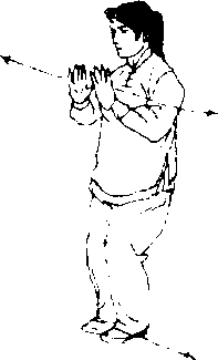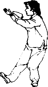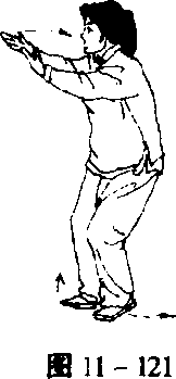 重心移于左脚,上右脚,再重心移于右脚,跟左脚,同时,左 手扶右腕挤出,目视前方(图11-121、122、123>。