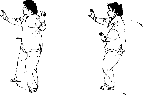 4. 盖步叉掌 重心偏于右腿,左脚向右脚前迈步,脚尖外