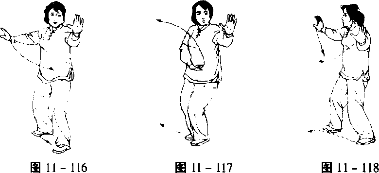 1. 收脚左云 重心移于右脚,收左脚,向右脚靠拢,全脚 掌着地,同时左手向下划弧至腹前,目视右手(图11-115)。