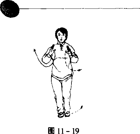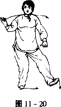 摆斜着落地,右脚跟略抬,两腿交叉弯曲,同时两臂向腹前划弧落 下,手心微向外,左手在上,右手在下,再上抬至额前,向左右分 开各划一圆至胸前,右手心向上,左手心向下,目视前下方(图 11-119、120)。